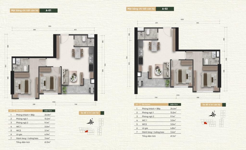 2 phòng ngủ: 59m2 – 65m2 – 67m2 – 68m2 – 70m2