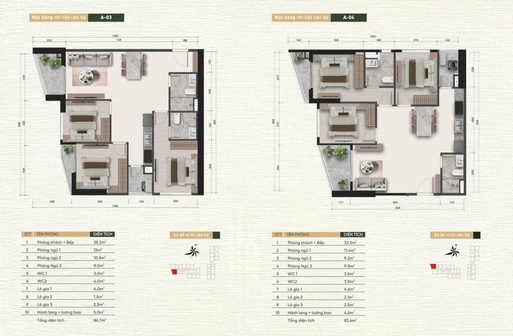 3 phòng ngủ: 97m2 – 93m2