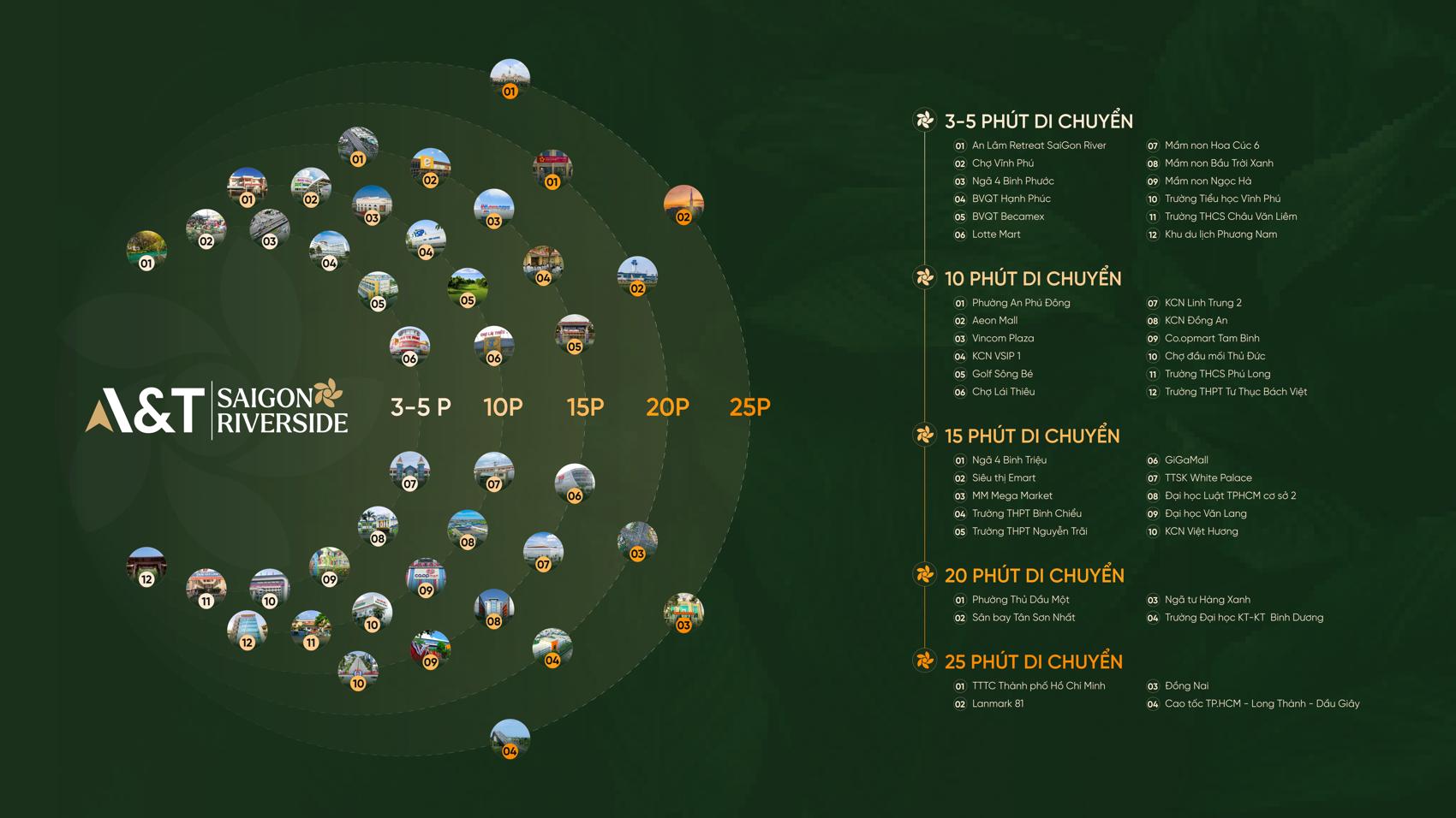 Từ dự án A&T Sài Gòn Riverside cư dân dễ dàng tiếp cận các tiện ích xung quanh: 5 phút đến Lotte Mart Bình Dương, Bệnh viện Quốc tế Becamex