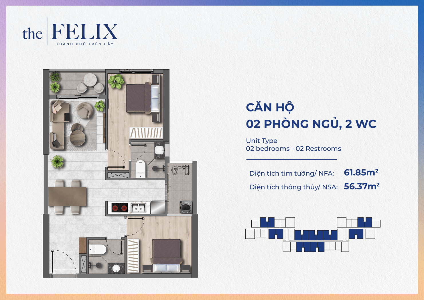 Căn hộ The Felix được thiết kế may đo tinh tế từng chi tiết đem lại cho quý khách hàng sự lựa chọn hoàn hảo về một tổ ấm, một nơi đáng sống bậc nhất hiện nay ngay tại Thận An, Bình Dương. Sự lựa chọn ngay từ thời điểm này là hành động đúng đắn nhất khi quý khách hàng mong muốn được sở hữu căn hộ mơ ước của mình.